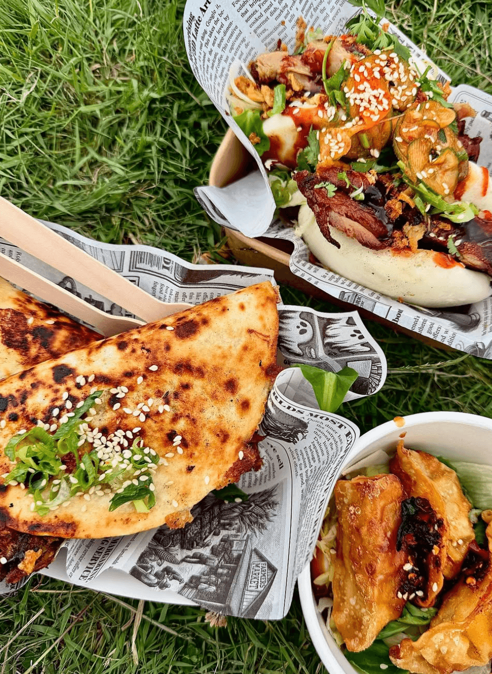 Chicken gyozas, Thai fish cakes, mini bao boxes, Asian tacos and loaded fries!