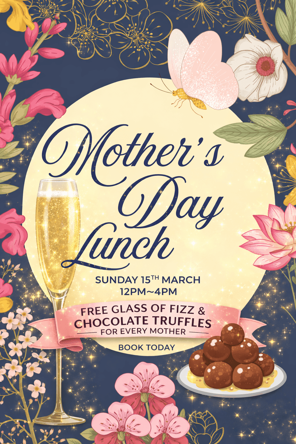 Mother’s Day Lunch – Sunday 15th March 12pm-4pm. Book in advance and we’ll gift your Mum a free glass of fizz plus some special chocolate truffles made by our chef!